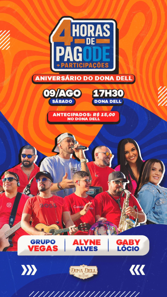 Quem comanda o som é o Grupo Vegas, trazendo o melhor do pagode para embalar a festa e colocar todo mundo pra cantar e sambar juntinho. E pra completar esse clima de celebração, duas artistas incríveis também vão brilhar no palco: Alyne Alves e Gaby Lócio.