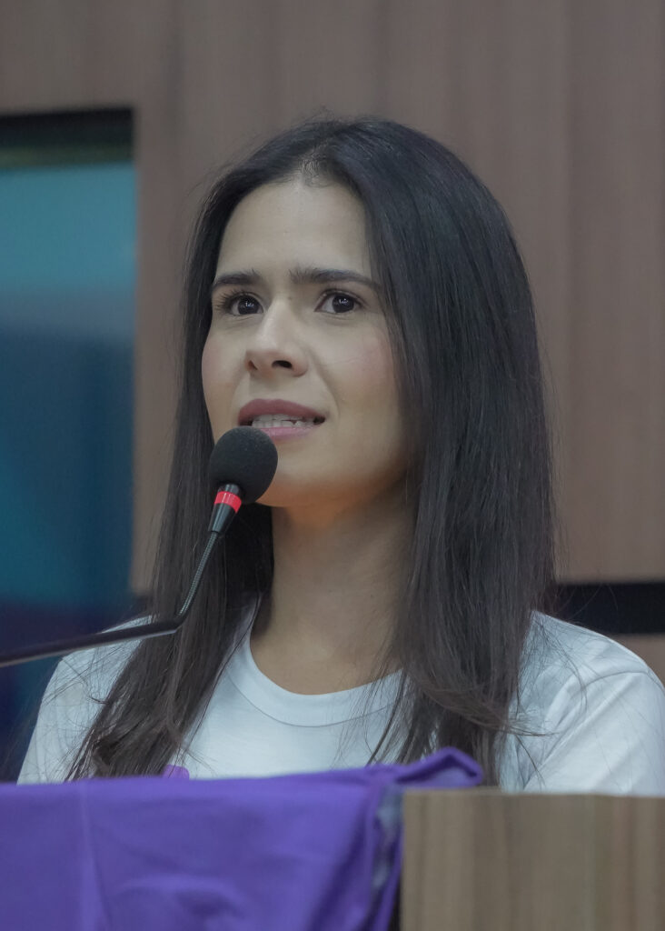 Durante sua fala, a secretária destacou a importância de discutir a origem da Lei Maria da Penha, explicando o contexto de sua criação, a história de Maria da Penha e a necessidade de implementação dessa legislação no Brasil para garantir proteção e justiça às mulheres vítimas de violência doméstica.
