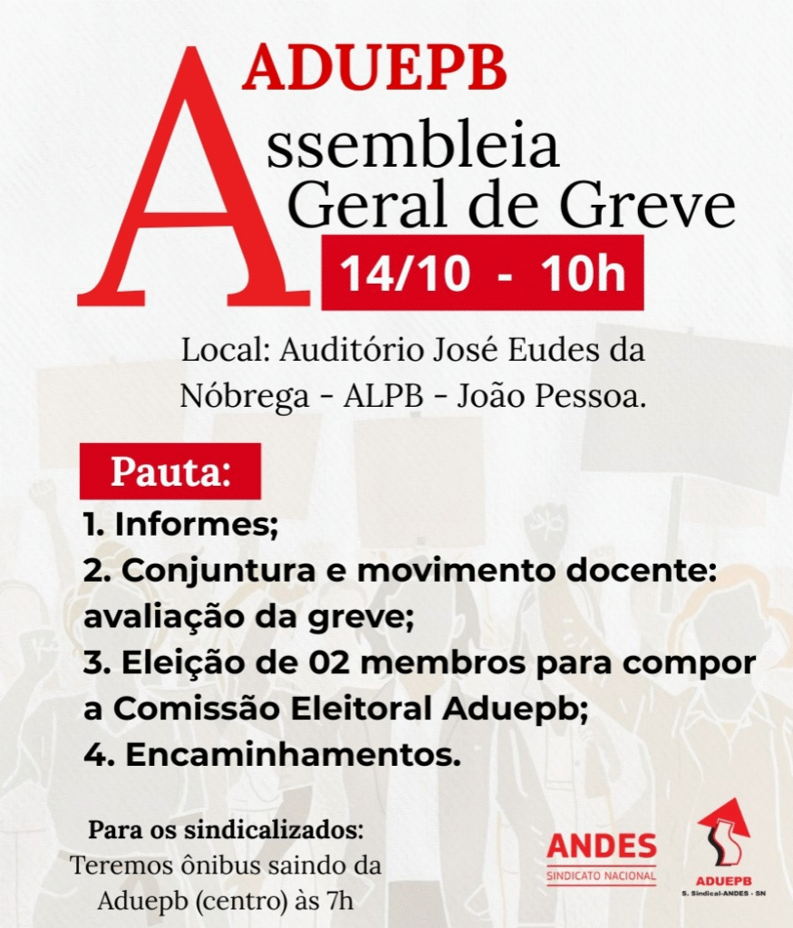 As/os professoras/es em greve da Universidade Estsadual da Paraíba – UEPB avaliarão nesta terça-feira (14/10) a sua paralisação, numa assembleia geral, no Auditório José Eudes Nóbrega, na Assembleia Legislativa, em JoãoPessoa, às 10h. A assembleia será presencial e descentralizada. Para as/os docentes sindicalizadas/os do campus de Campina Grande, que tiverem interesse em participar, será disponibilizado transporte.
