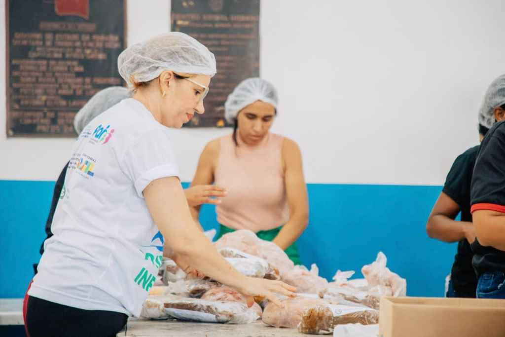Entre os produtos distribuídos estão verduras, batata-doce, frango ou carne, doce de mamão e polpas de frutas, alimentos provenientes da agricultura familiar, que contribuem para uma alimentação mais saudável e nutritiva para as famílias.