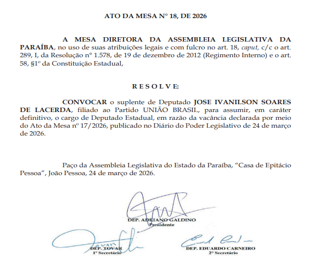 José Ivanilson Soares de Lacerda, conhecido politicamente como Nilson Lacerda, foi convocado para assumir em definitivo o mandato de deputado estadual na Assembleia Legislativa da Paraíba. A medida foi formalizada por ato da Mesa Diretora da Casa, em razão de vacância declarada no Parlamento estadual.